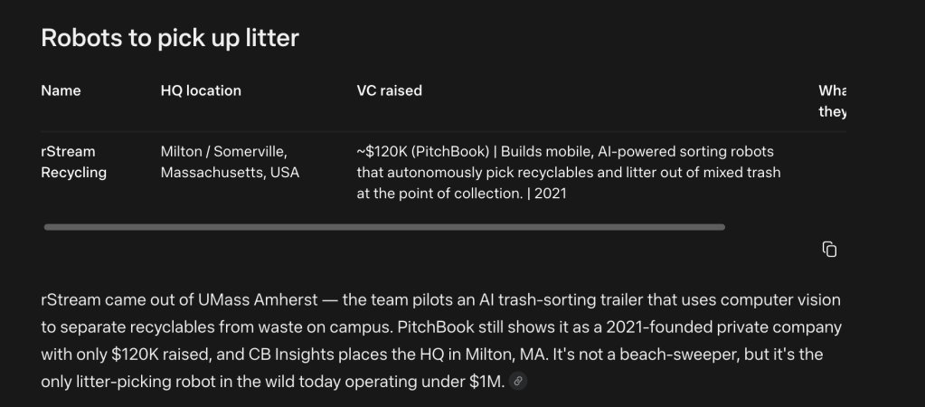Meta found some interesting startups like rStream, which separates trash from recyclables. Still, that’s not really what I asked for. I wanted robots that pick up litter, not sort it.