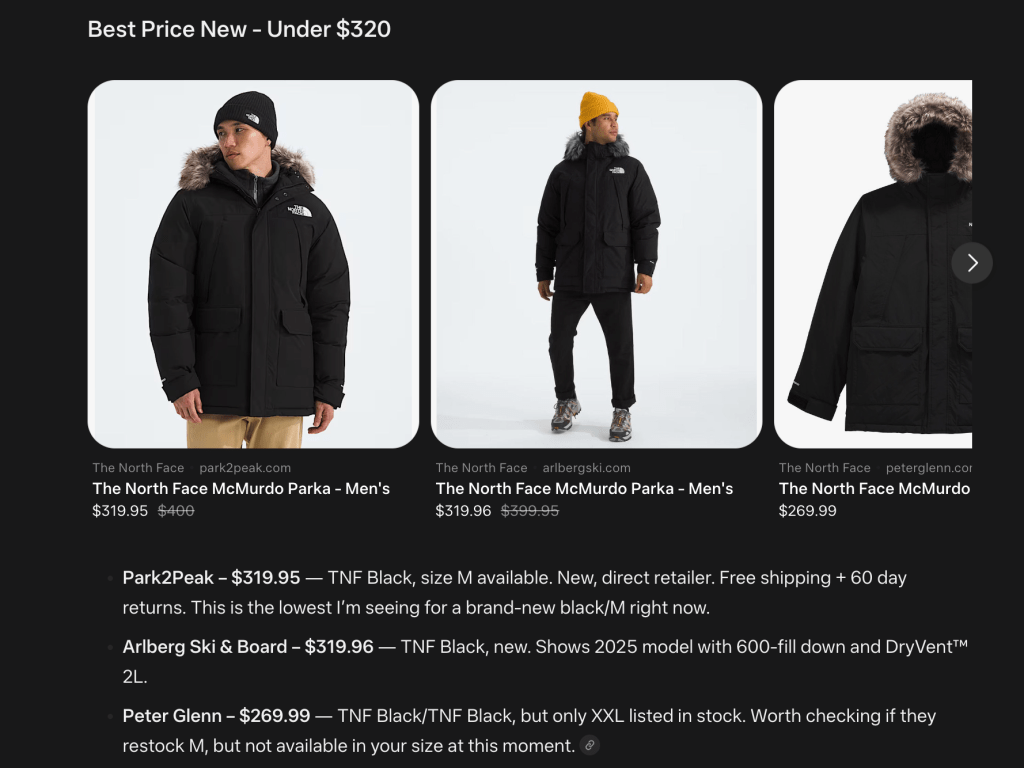 For the final round, I did something totally different. I noticed that Meta has a shopping feature. Maybe this can help me find a deal on the parka I’ve been looking for?