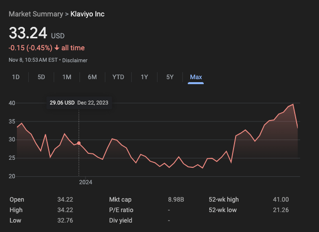 Klaviyo is growing about 25% YoY and making a small loss. If it could get to profitability, the stock could rip.