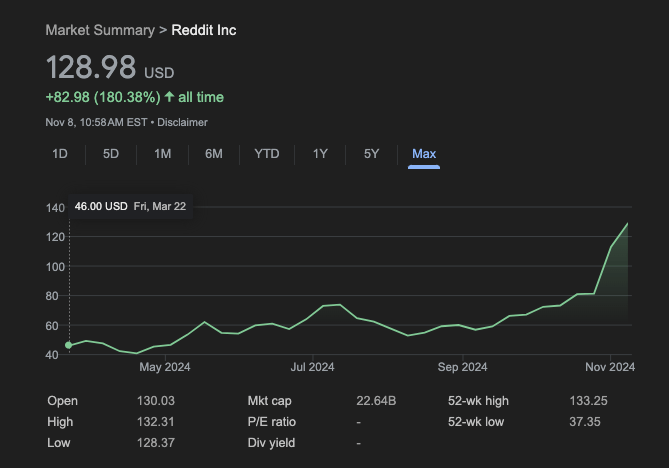 Reddit — The biggest surprise on this list is Reddit. The social media site went public in March and has nearly tripled since!