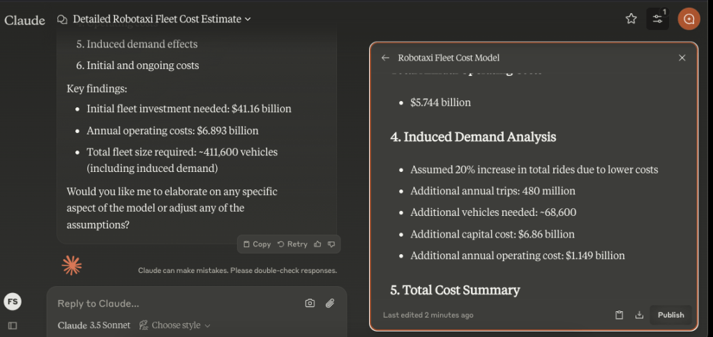 Claude got the replacement cost of normal Uber/Lyft rides with robotaxi rides correct. But it skipped the part of the question about replacing the entire US auto fleet.