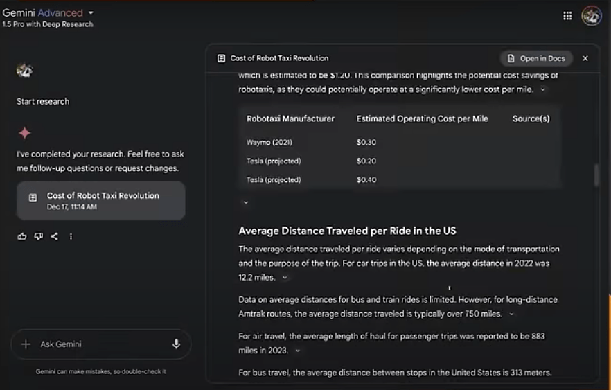 Gemini accounted for bus trips and flights that could be replaced by robotaxis. It also calculated the maintenance costs for the robotaxis, something all the other models ignored.