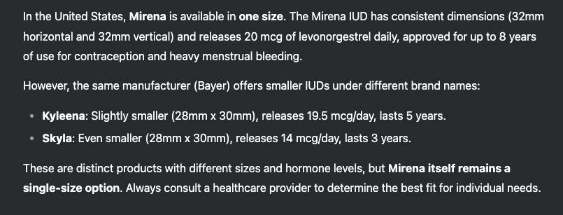 Here’s the prompt I used: “in the United States, is there only one size of Mirena IUD available?”