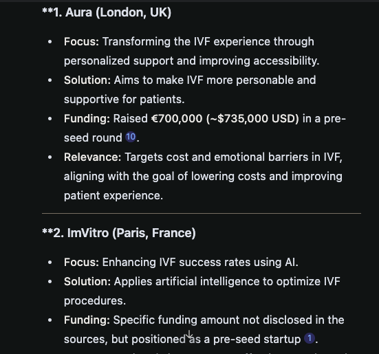 “What are the most interesting startups at pre-seed stage working on solutions to increase fertility? Consider startups to lower costs and improve effectiveness of IVF, and also startups to improve egg health for older women, among other possible ways to boost fertility. Please only show me startups that have raised $750,000 or less in funding.”