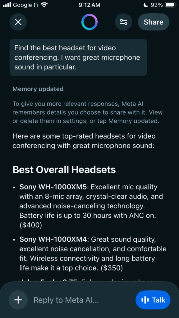 I asked Meta to find me a great pair of headphones for Zoom. My cheap JVC’s are getting the job done, but the sound quality could be better. Let’s see how it does…