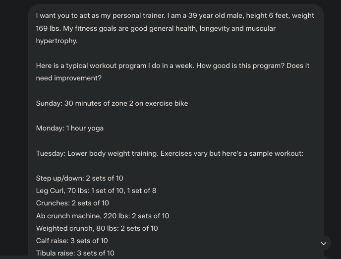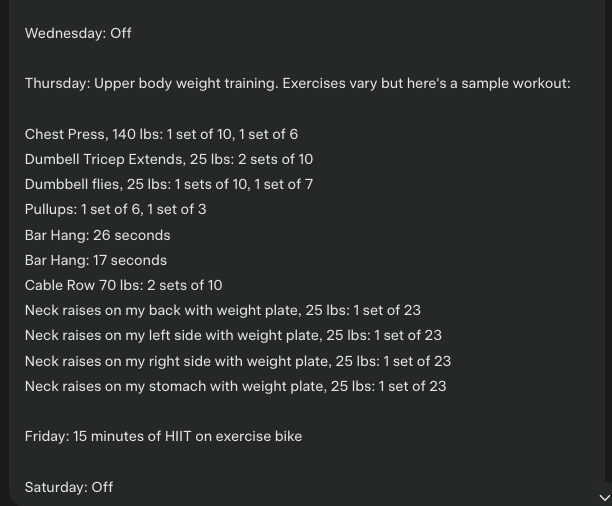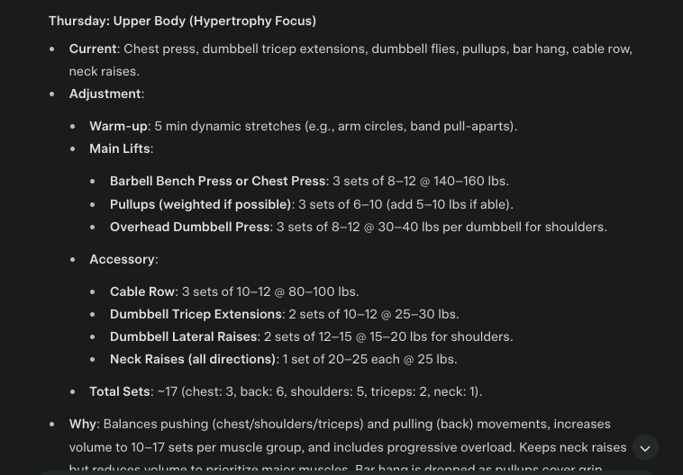 This morning, I typed a week’s worth of workouts into Grok 3, my favorite LLM at the moment. I gave Grok my goals: general fitness, longevity, and bigger muscles. Because hey, why not?