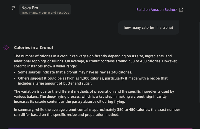 My first 2 questions were pretty simple, and I ran them on Nova Pro. For this last one, I’m using Nova Premier, Amazon’s best in-house model.