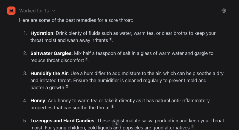 Magistral gave me some good ideas, including honey and saltwater gargling. The suggestions had great citations, including Penn Medicine’s website.