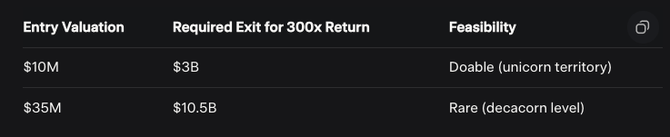If I get in at a $10m cap, I need the company to hit a $3 billion valuation for the math to work. This isn’t easy, but it’s doable.