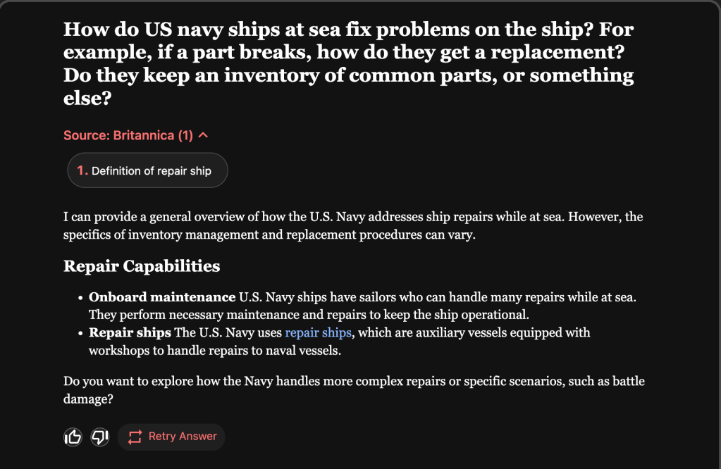 But again, Brittanica didn’t cite its own wonderful articles! Instead, it kicked the query to ChatGPT. I can’t verify if the response is accurate.