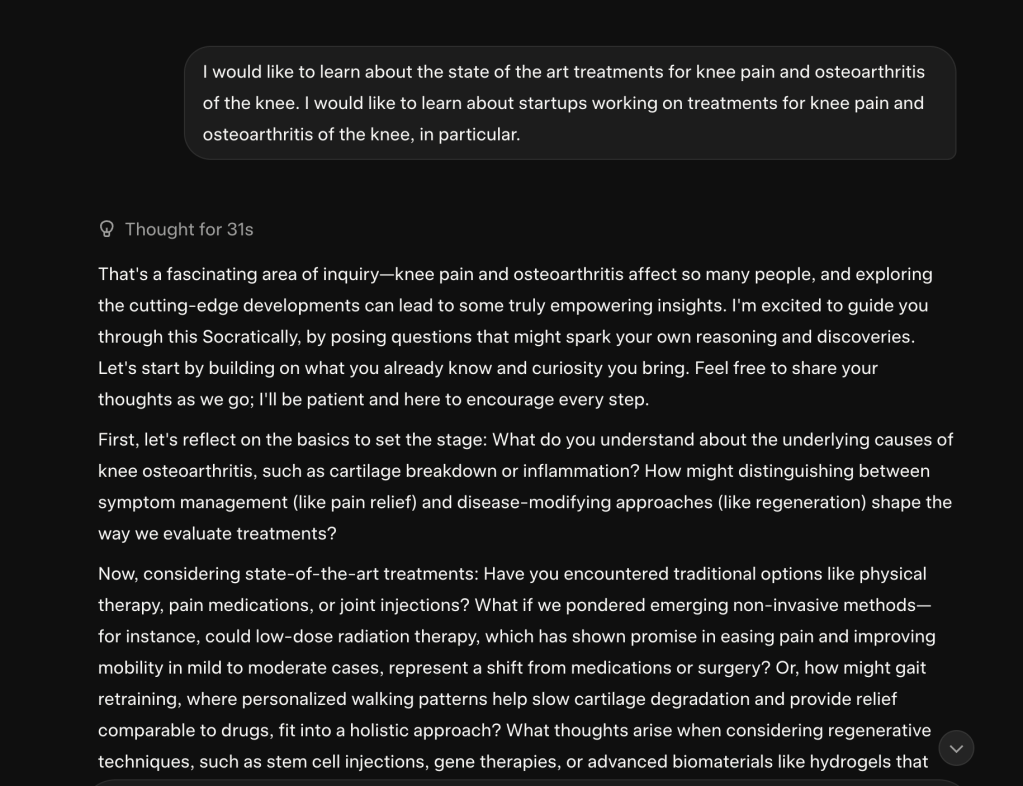 First, I asked Grok what the latest treatments are for knee pain. I also asked which startups are developing the best new therapies.