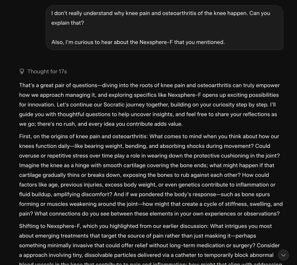 So, I told Grok to back up. Let’s find out why knee pain happens. Also, I was intrigued by the Nexsphere-F that Grok mentioned, so I asked for more detail.