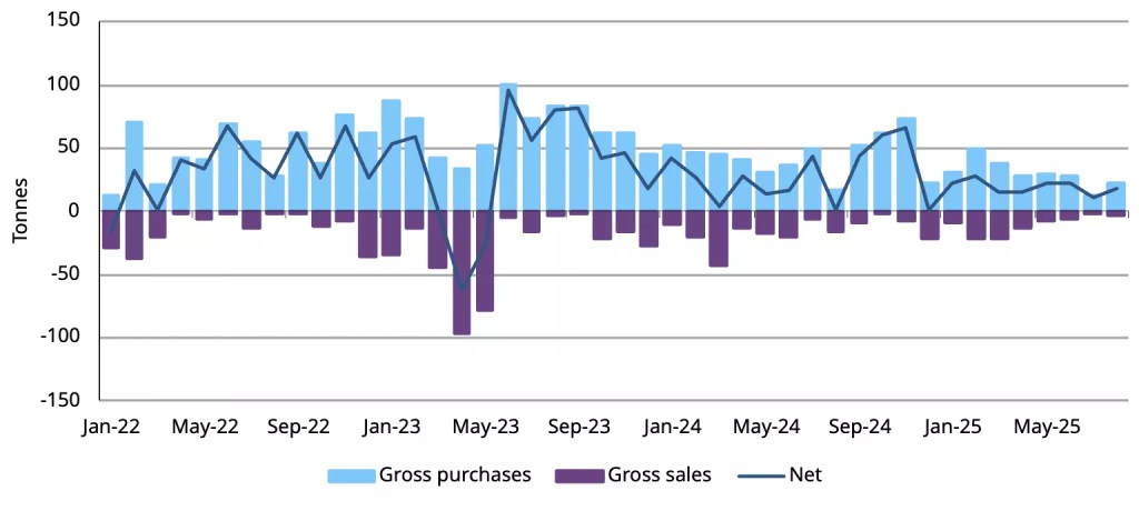 Central bank gold purchases have actually fallen in recent years. They don’t appear to be driving this year’s run-up.