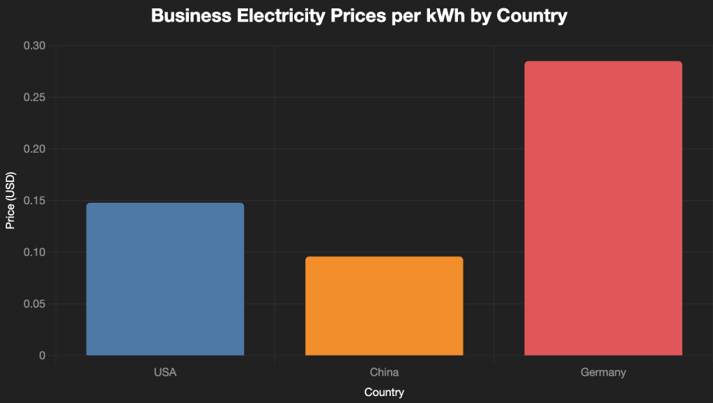 Imagine you run a German car maker. If you produce a car in Germany, you’ll pay high electricity rates and hefty US tariffs. If you make them in Texas, you’ll pay half as much for electricity and no tariffs.