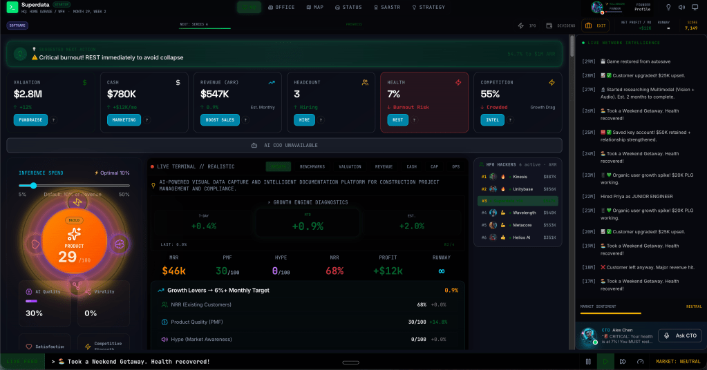 Founderscape lets you build products, hire teams, and raise money. I just played this morning and almost ran my startup into the ground!
