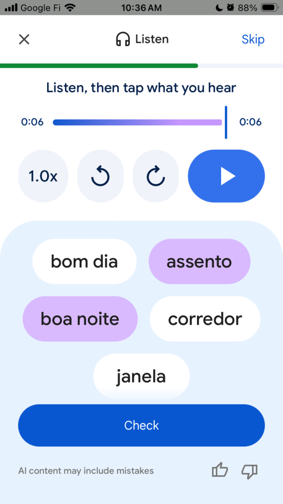 The dialogue was helpful, but a little too scripted. Google had me ask questions which might not actually come up. I prefer the more free-flowing conversations on Duolingo Max, Duolingo’s new AI conversation feature.