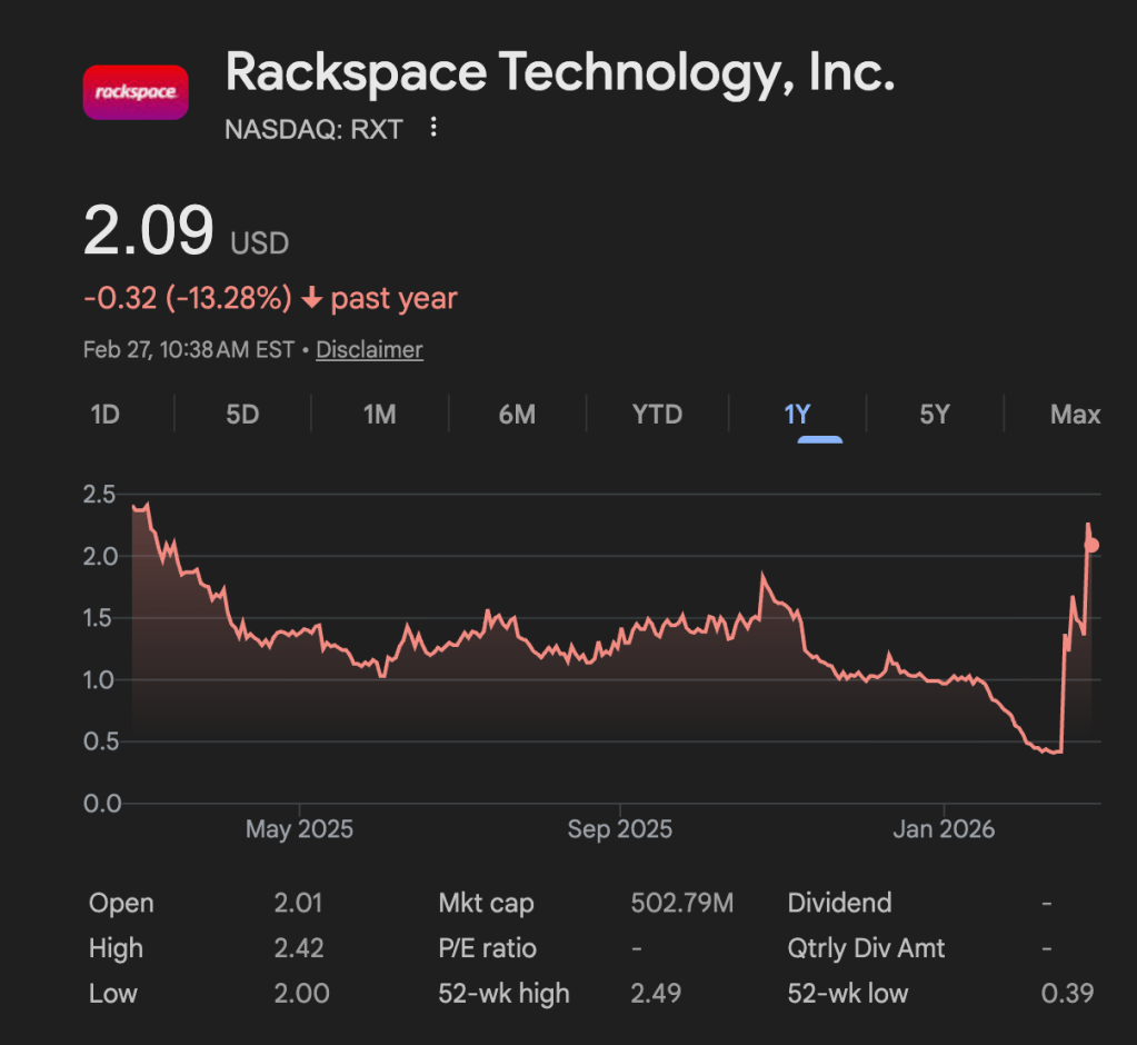 As miserable as OpenText and RingCentral have performed, they’re nothing compared to the ugliest duckling of SaaS: RackSpace.