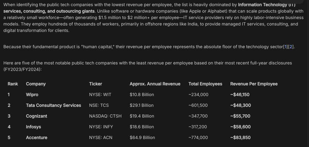 Gemini found that tech outsourcing companies like Wipro and Tata make the least money per employee. This simple white-collar work will be the first target for automation.