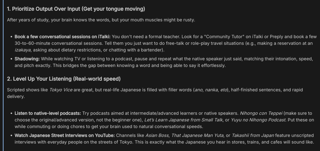 Gemini has some excellent ideas, like talking with native speakers on iTalki. It even reminded me of an awesome YouTube channel I used to watch, That Japanese Man Yuta.