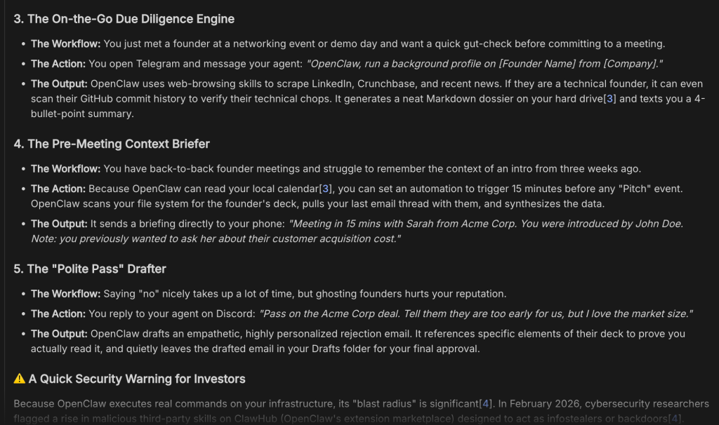 I recently stood up a hosted version of Openclaw. What sort of agent would be useful to me as an angel investor?