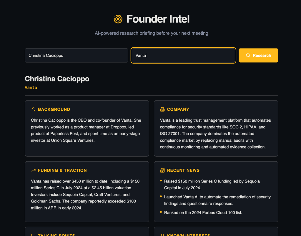 Even if the output wasn’t perfect, making Founder Intel was fun! If you have folks on your team that are struggling with AI, a vibe-coded tool could be a great way for them to interact with it.