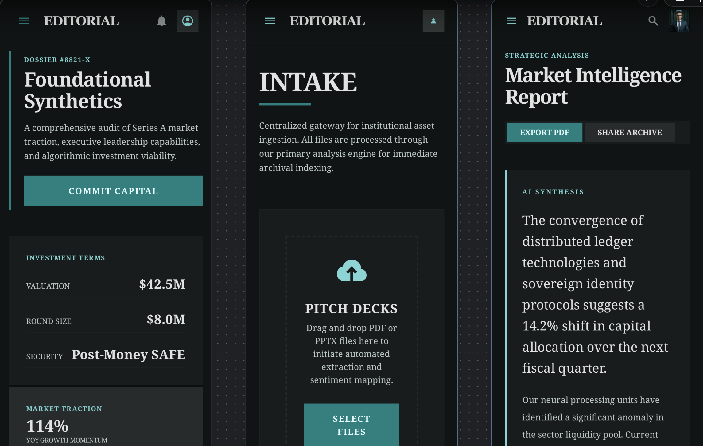 “Make an app to help angel investors research a startup. I should be able to upload the deck and also include links to any web pages that I want. I want the app’s design to be minimalist. I want it to be dark mode.”