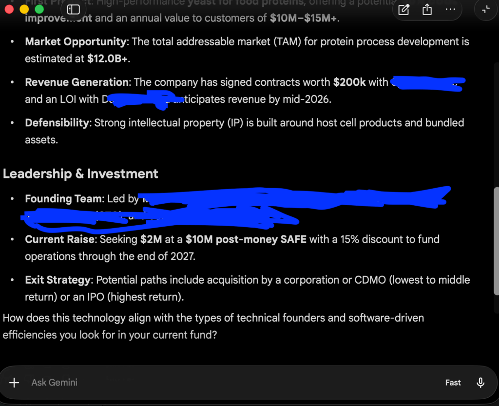 This afternoon, I’m meeting with a fascinating startup working on biomanufacturing. Gemini did a great job of summarizing the deck (key details redacted).