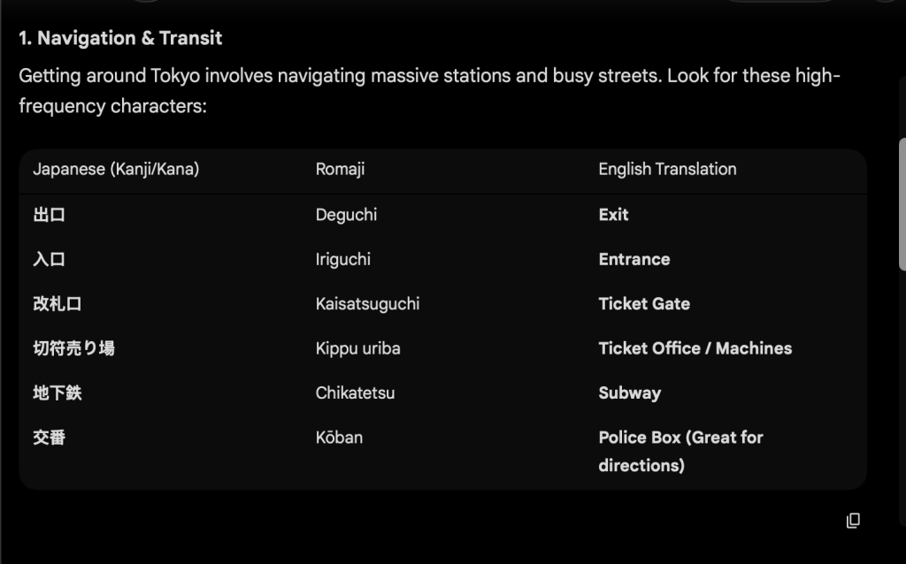 I told Gemini to give me some common signs I’ll see in Japan, along with English translations.