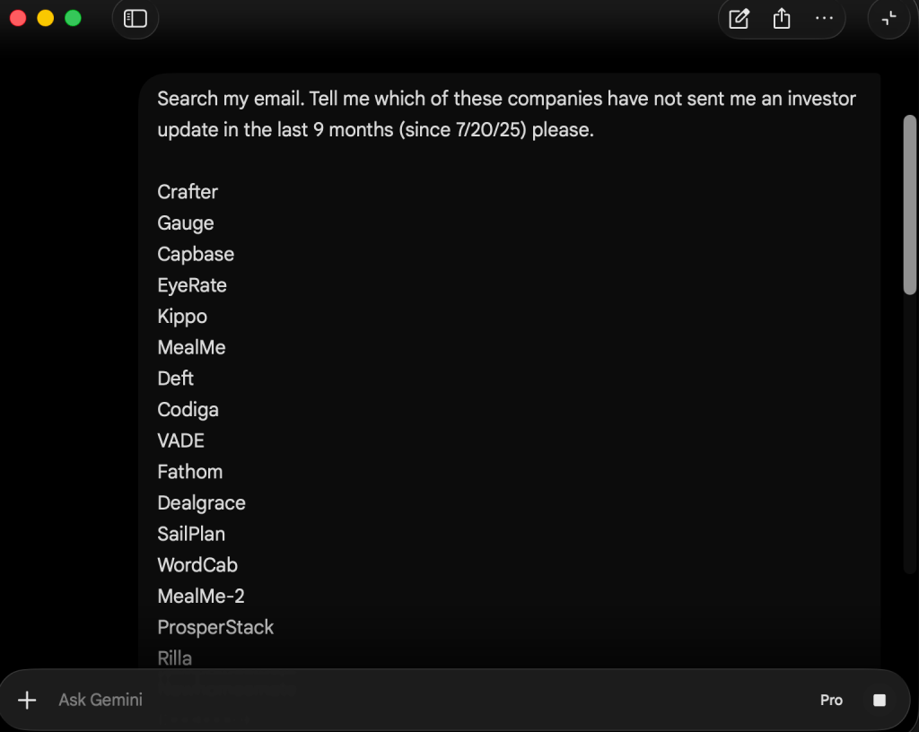Then, I tried it again on Fast mode. This time, Gemini gave me results. But they were completely incorrect! It flagged companies that just sent updates in the last few days.